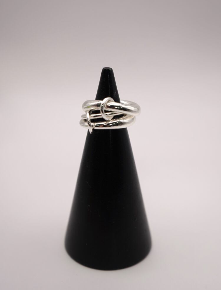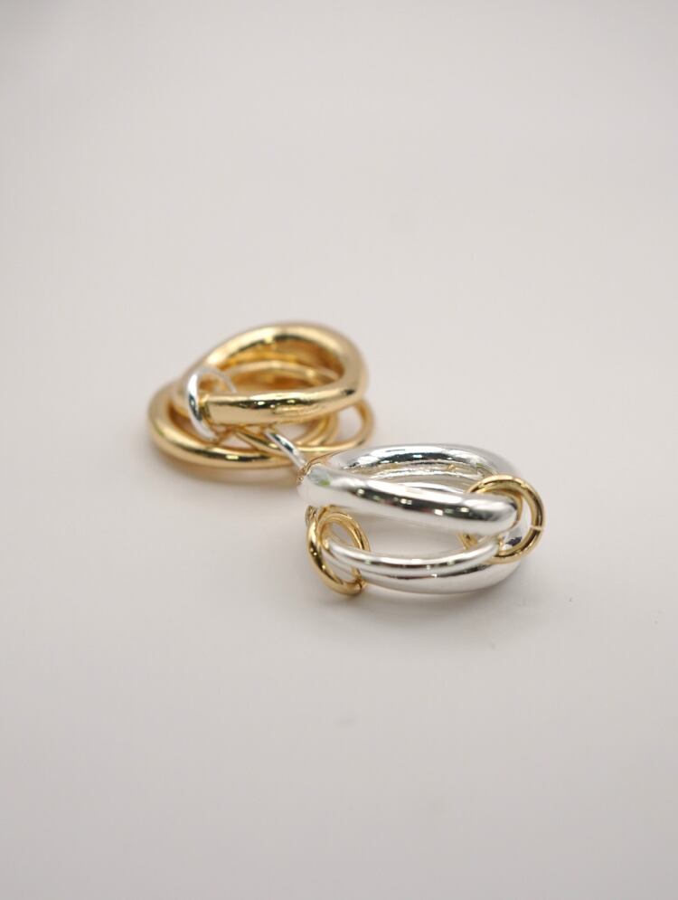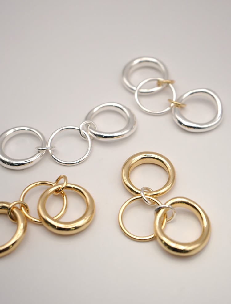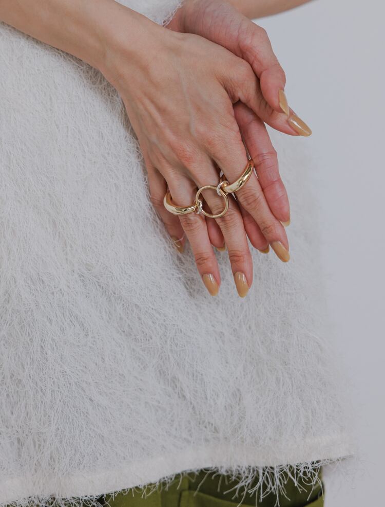 滑らかで抑揚のあるオリジナルリングそれぞれ2本とシンプルリングを組み合わせた3連リングは、3本重ねてまとめてつけたり、それぞれ1本ずつ横並びでつけたりと様々な着け方が愉しめます。程良いボリューム感と女性らしいデザインは、着けるだけでぐっと印象的な手元に◎シルバー、ゴールド、SV×GDミックス、GD×SVミックスの4色展開をご用意いたしました。こちらのリングは3本まとめて着用することを想定し製作している為、3本の指に横並びにつける場合は少しゆとりのあるサイズ感になりますので予めご了承ください。