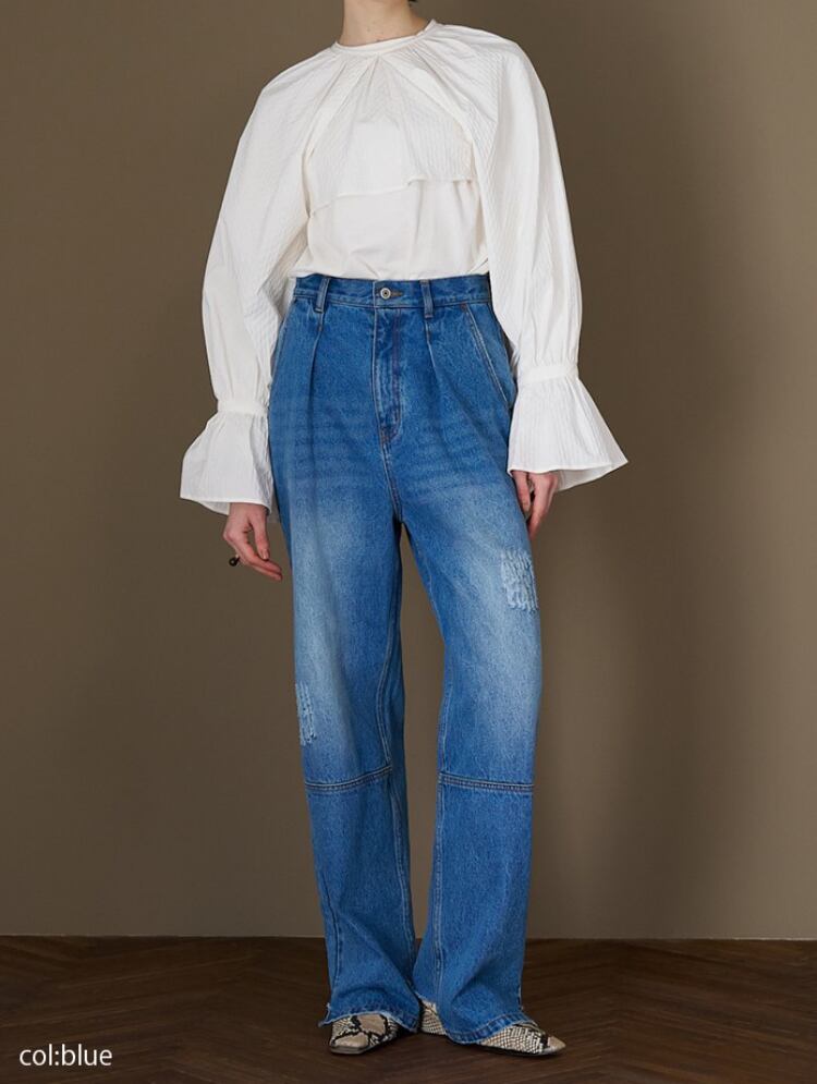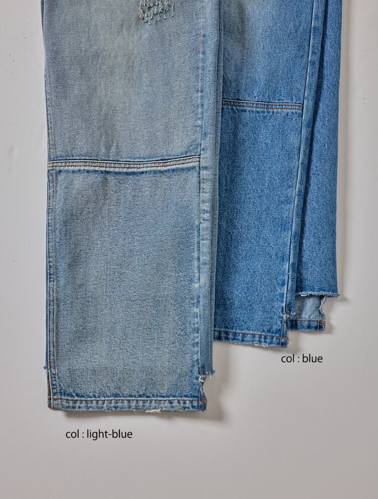 膝下にいれた切り替えデザインや、ところどことに施したさりげないダメージ加工など、こだわりのつまった1枚です。
