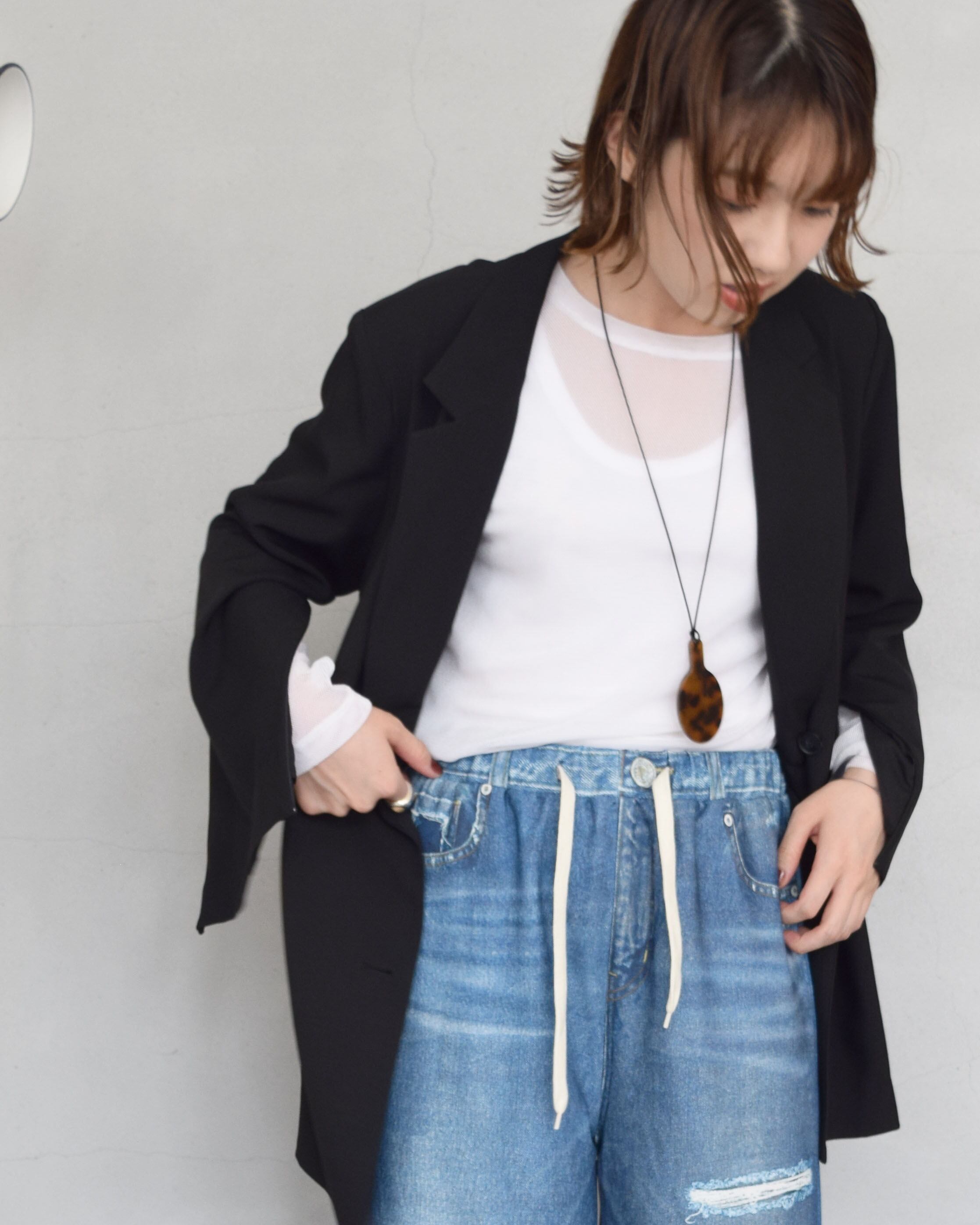 マニッシュな雰囲気の襟元と、程よいゆとりのサイジングがポイントです。