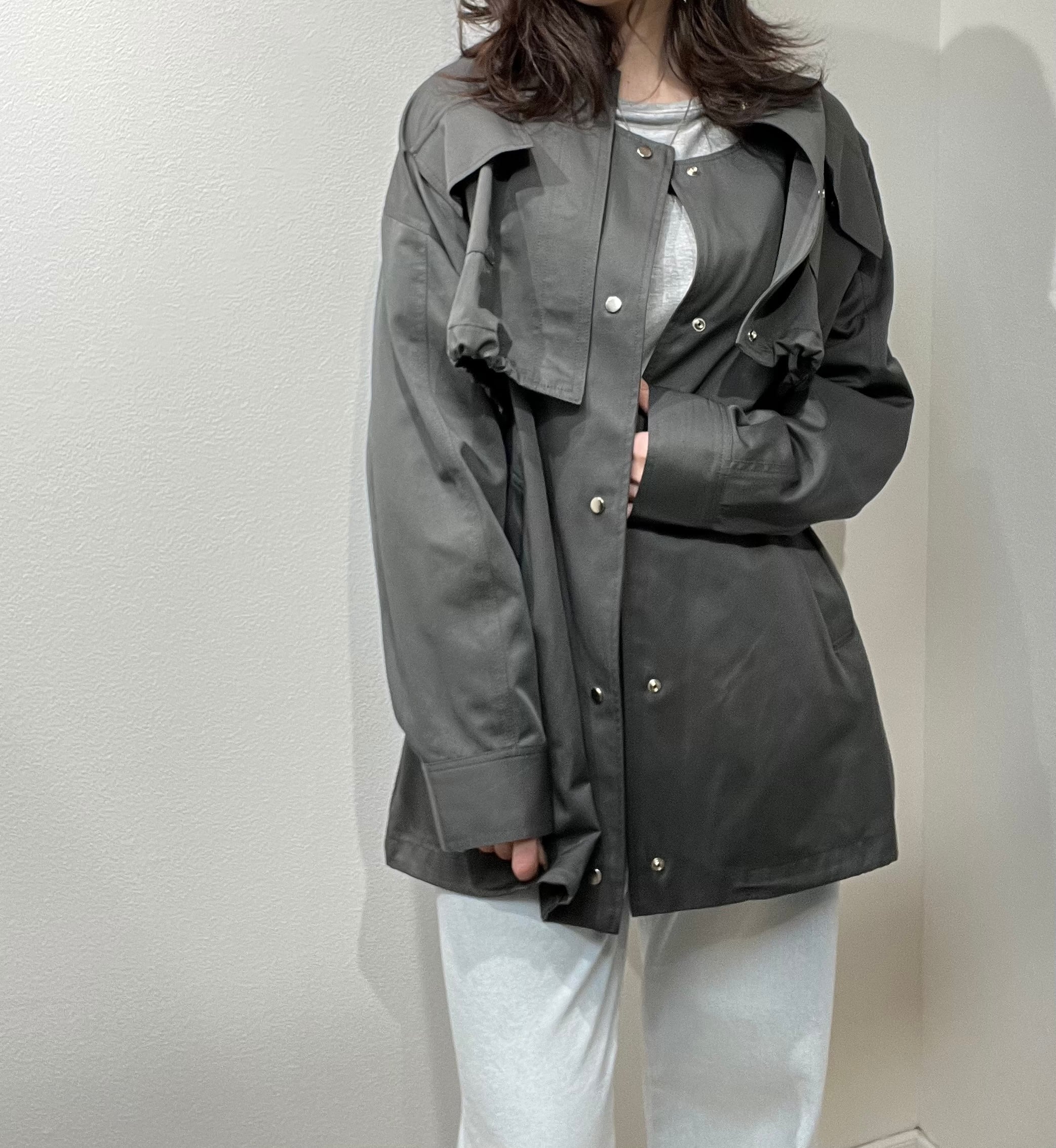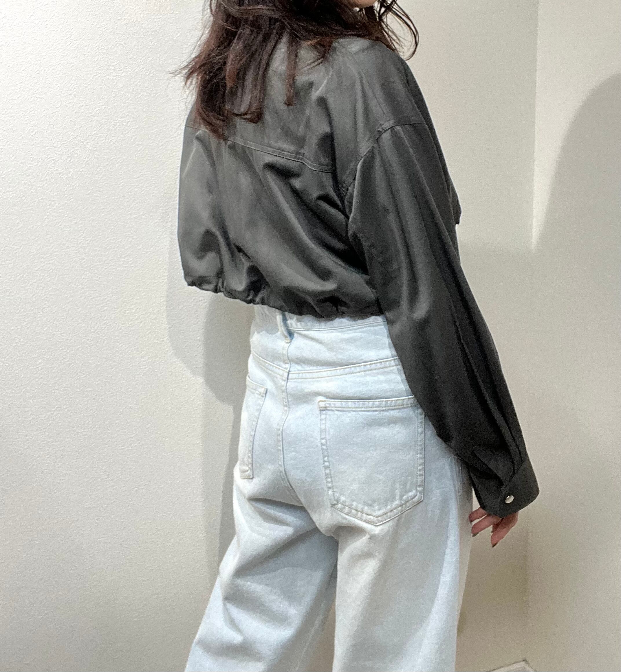 ショート丈ブルゾンはAラインに広がる為、若干ドロストでシルエット調節して着て頂くのがおすすめです。
