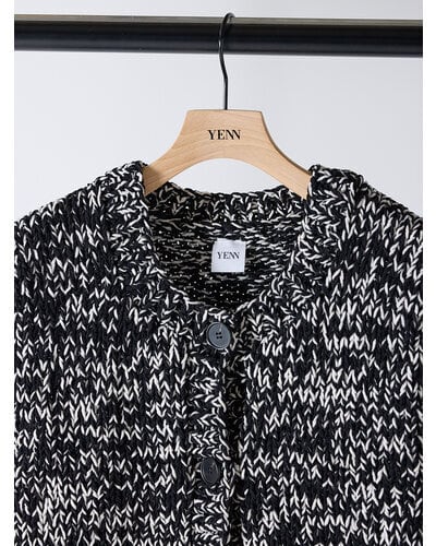 2色の糸を一緒に編んで作るMIXカラーがポイントです。太番手の糸で手編みすることで、ざっくりとした風合いのハンドメイドのようなノスタルジックな印象に仕上げました。しっかりボリュームがありながら、とても軽い糸なので、ストレスフリーでレイヤードスタイルを楽しんでいただけます。左裾に施した“YENN”ロゴテープもポイントです。