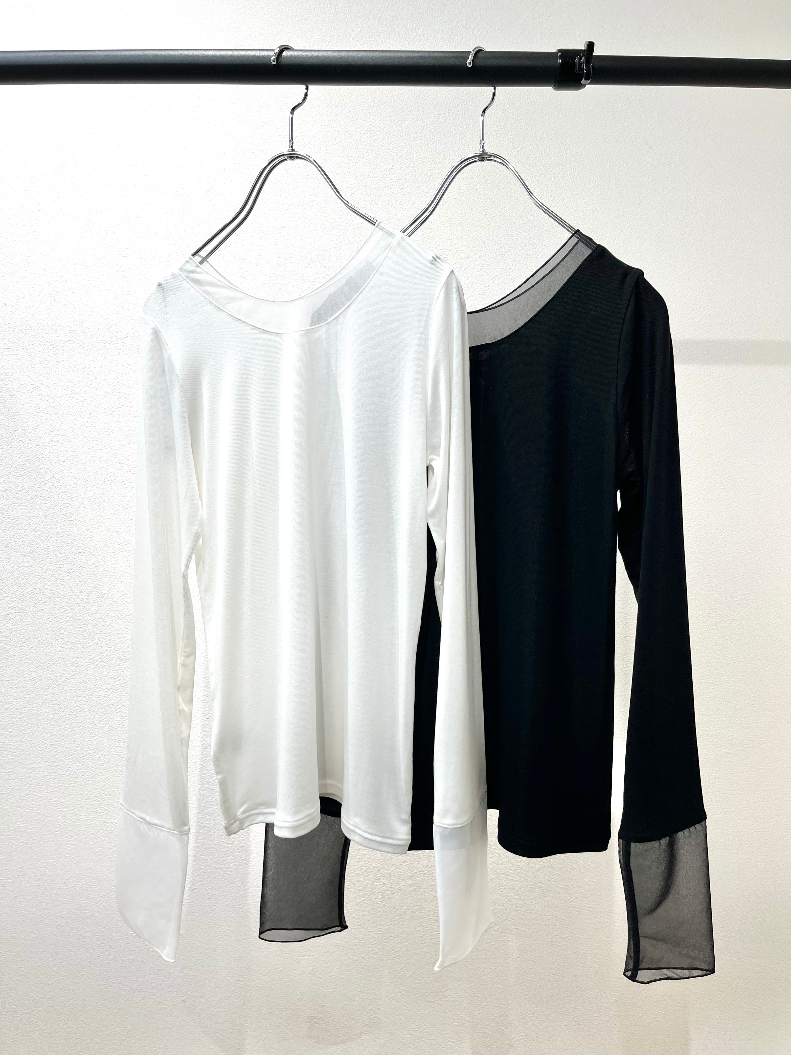 ≫≫チュール素材のドッキングデザインが目を引く、トレンド感あふれるシアー長袖トップス。