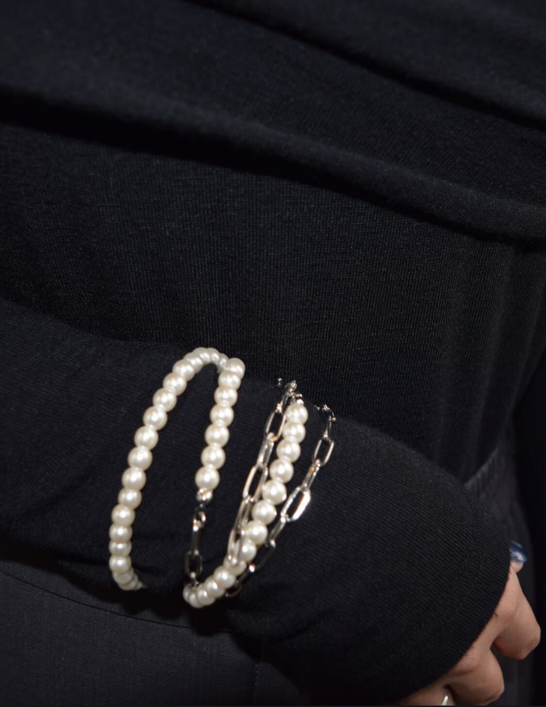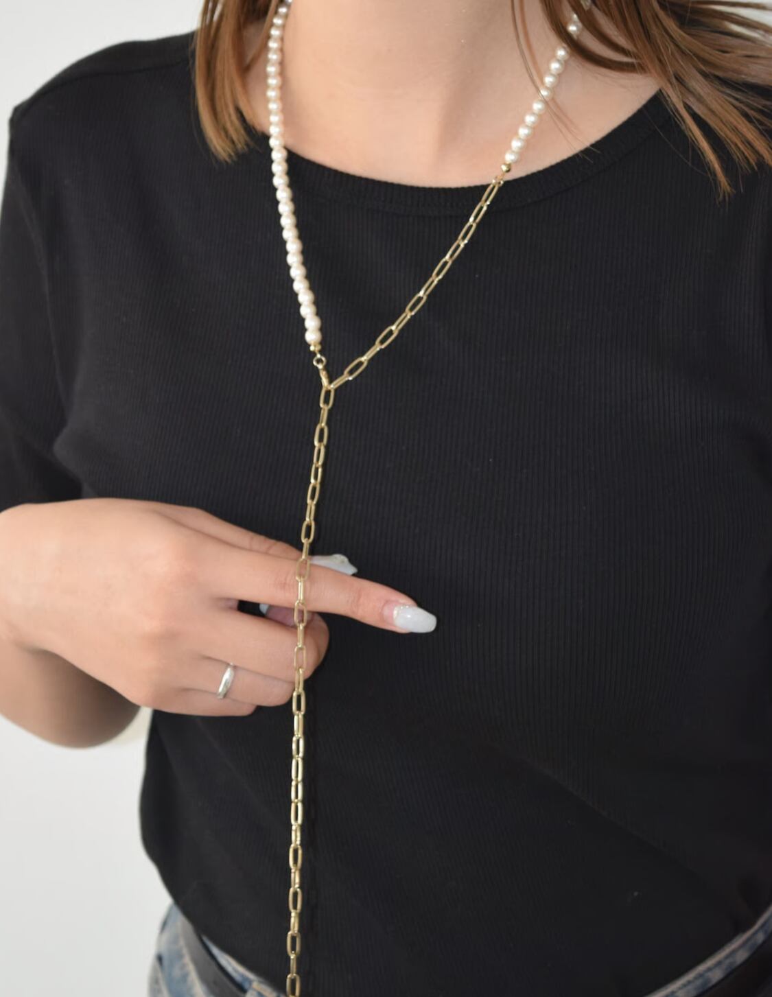 カジュアルにも使いやすいようにパール×チェーンのコンビネーションにしました。