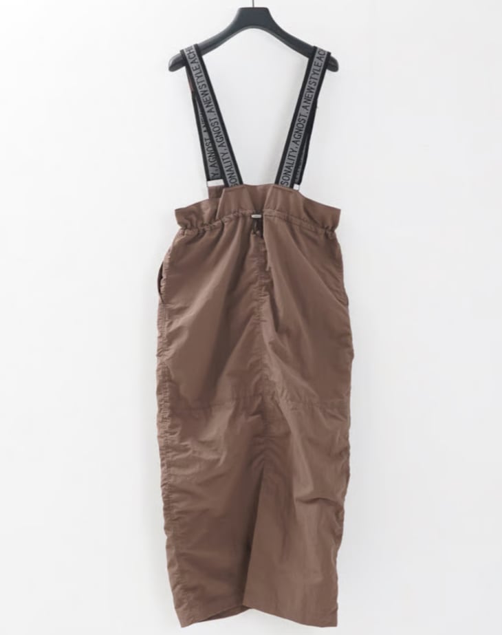≫≫オリジナルロゴを配したサスペンダーが目を惹く一枚。通年使える肉感の合繊ツィルは軽やかな着心地を実現。コクーンシルエットは体型を選ばず、自由に設定できるウエスト位置で脚長効果も期待。チャコール・ブラック・ブラウンの3色でモードにもカジュアルにも自在にスタイリング可能。