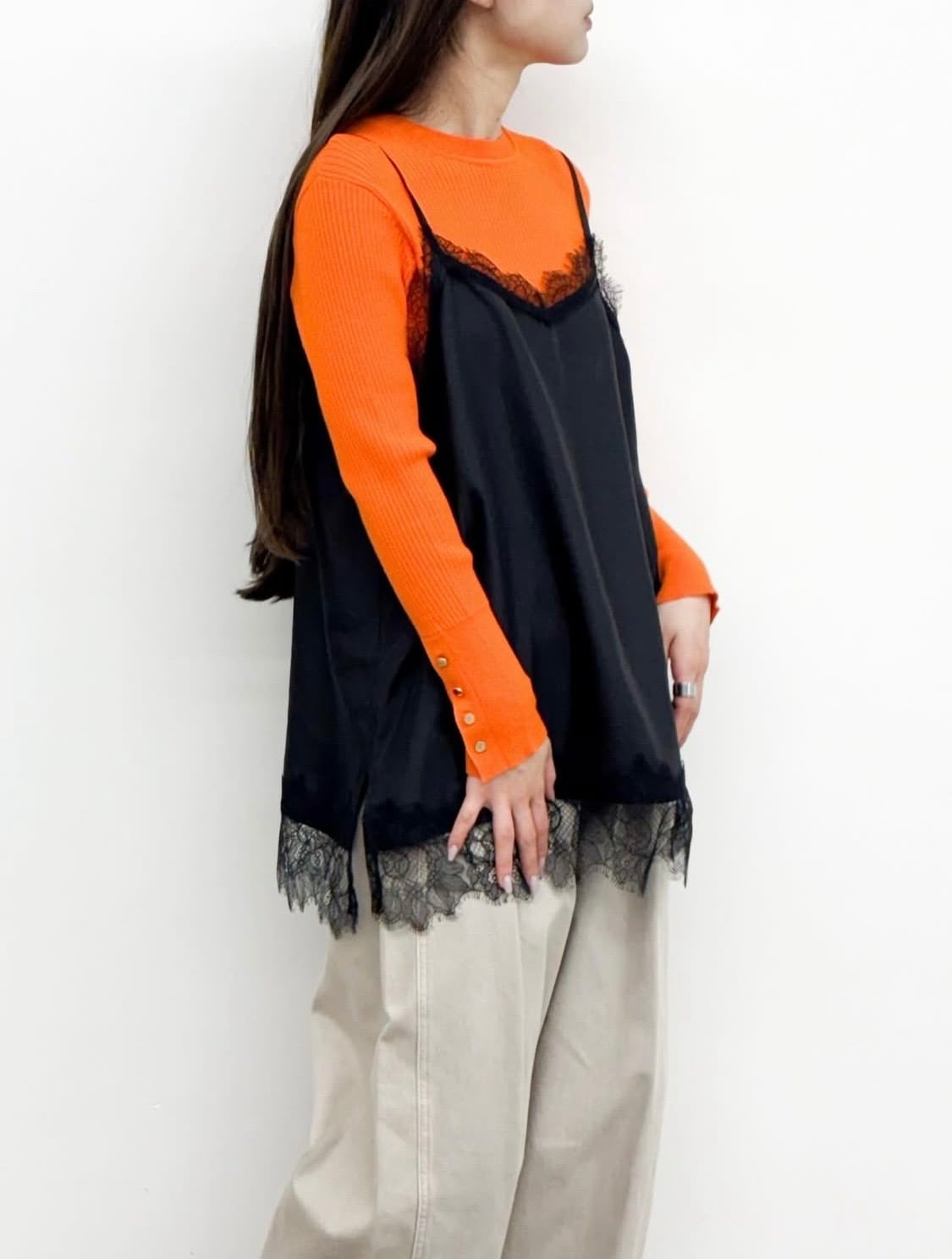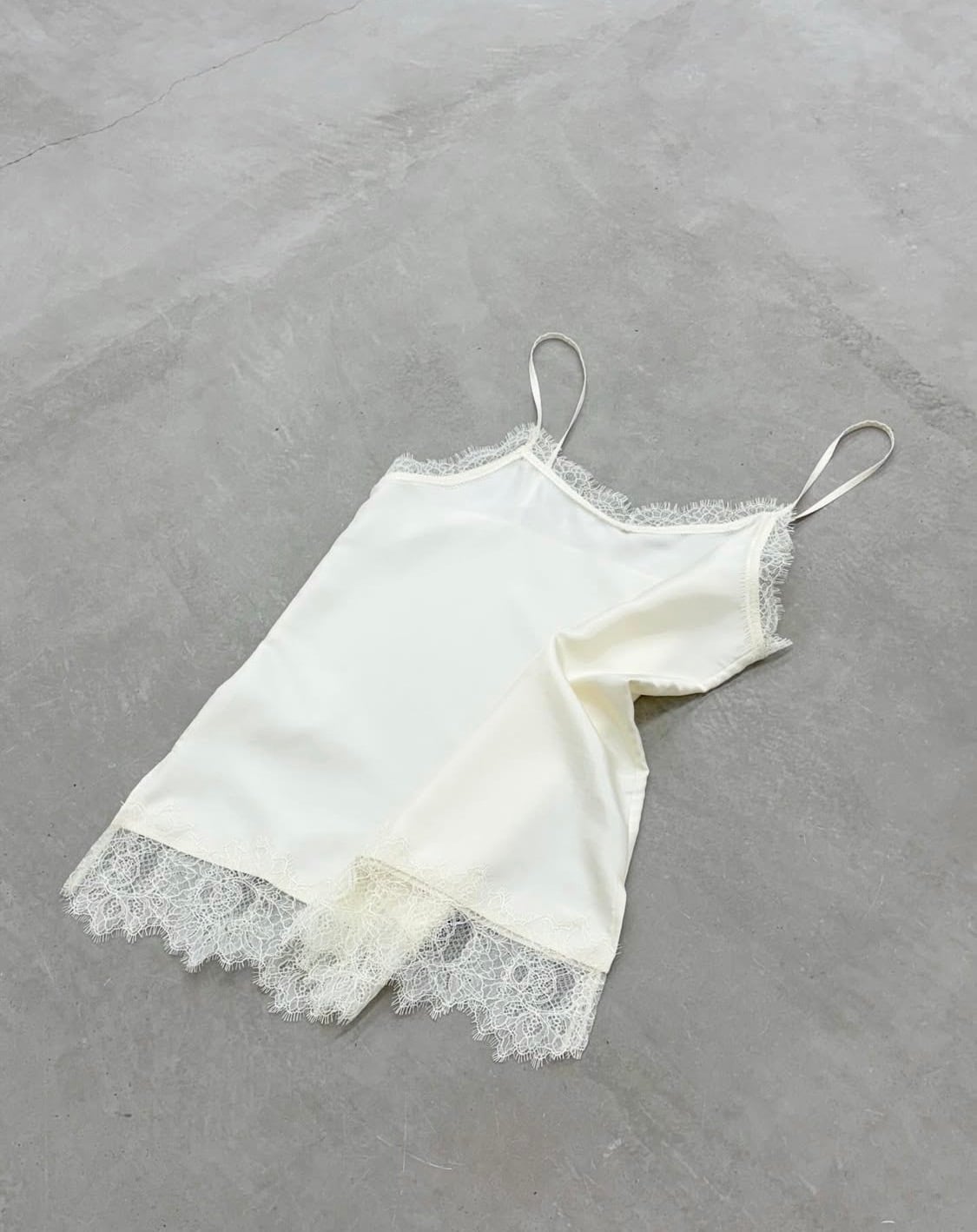 ヒップにかかる丈のキャミソールは繊細なレースを使用したランジェリー風なデザイン。