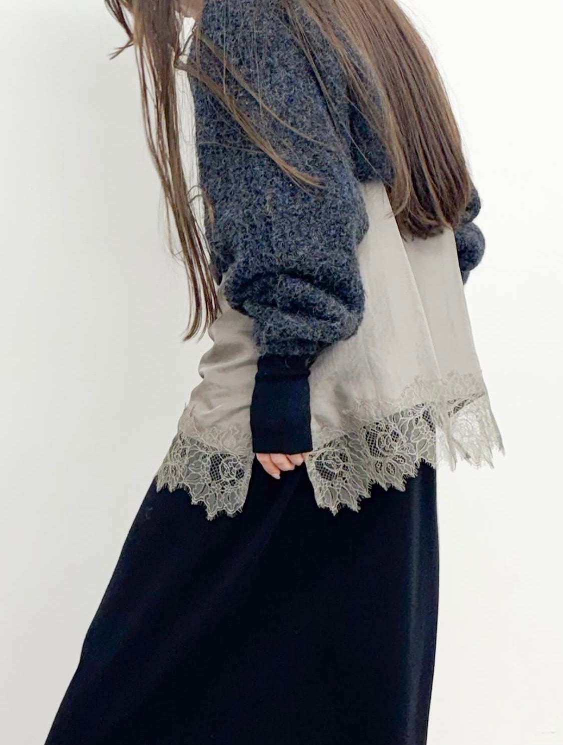 スウェットやニットにインしてもらうのはもちろん、ジャケットなど中に着て、胸元のレースをチラ見せするのもオススメのコーディネートです。