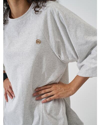 たっぷりとボリュームをとったオーバーサイズのシルエット。ラグラン袖を採用することで、着膨れせずすっきりと見えるように設計しました。 表面がさらっとした少しきれいめな綿ポリエステルのカットソー生地を採用、胸に金属チャームを付けて都会的な印象のカジュアルトップスに仕上げています。 脇のシームPKもポイントです。
