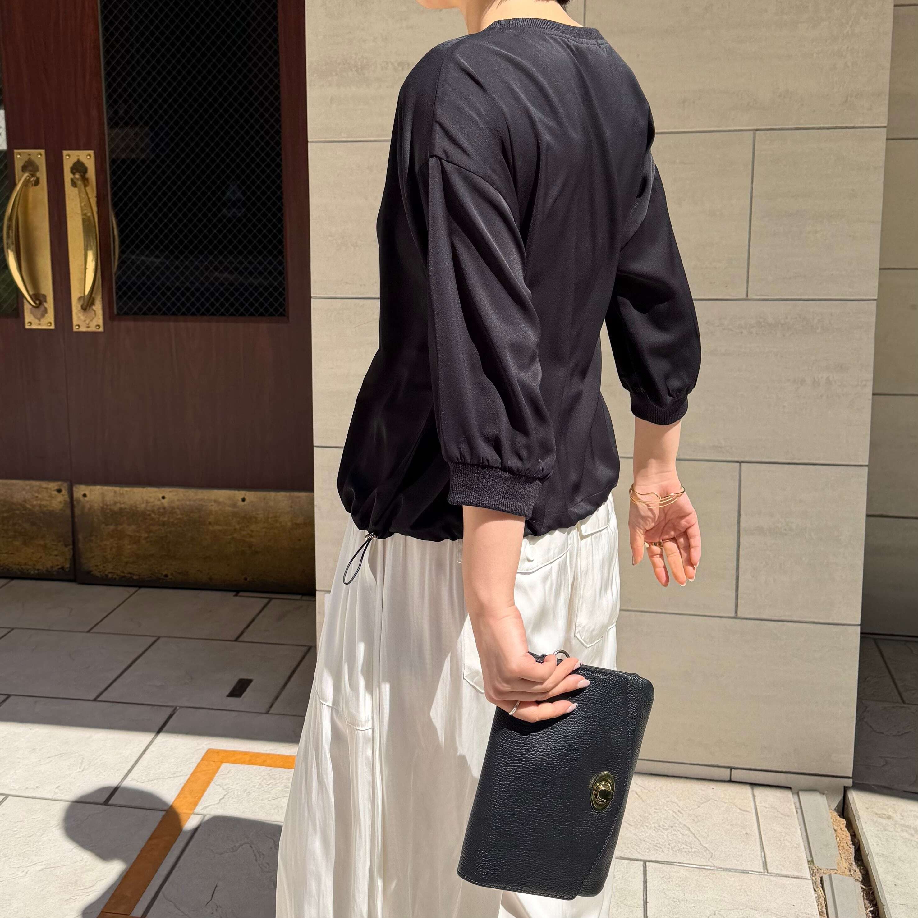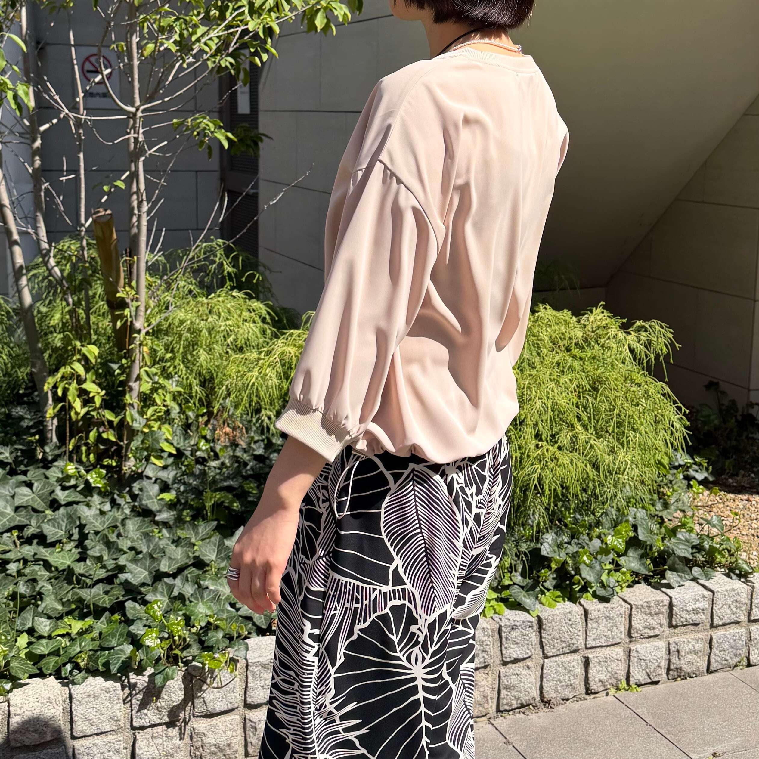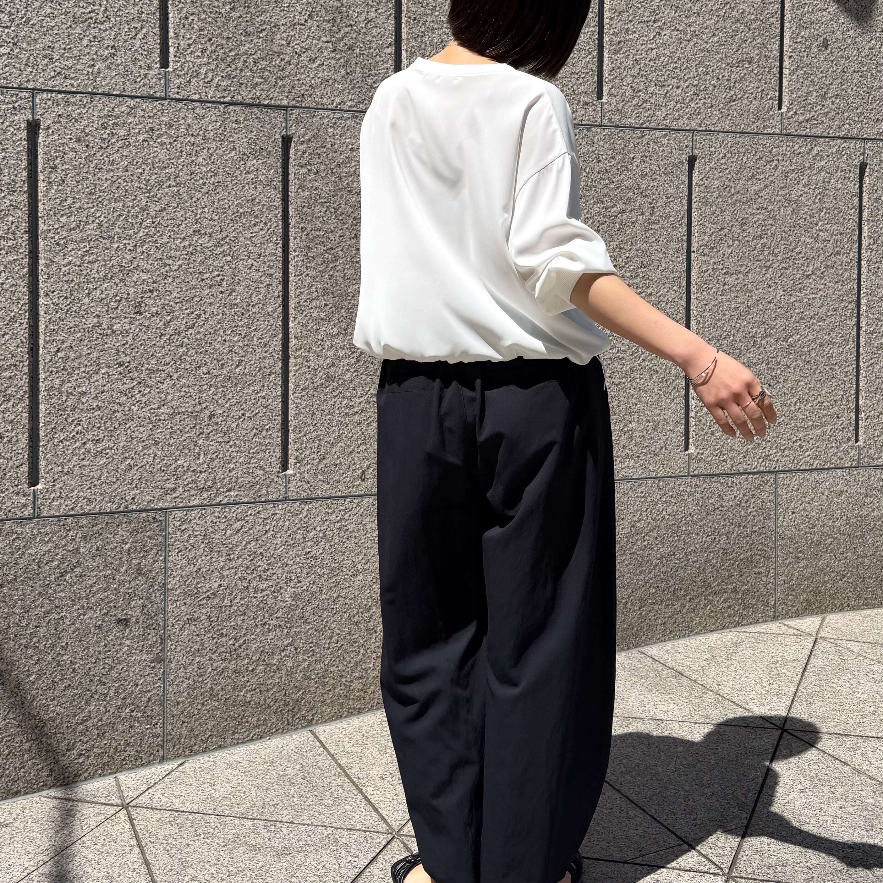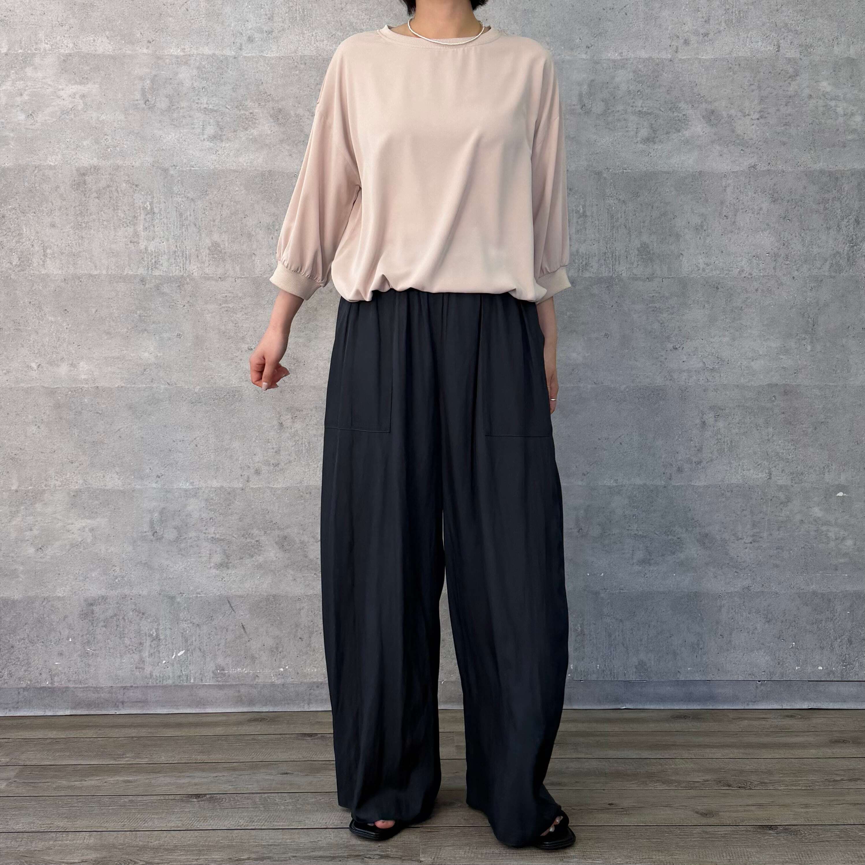 ベーシックながらも襟ぐりと袖口にリブ地を使い、裾もゴムで調節できます