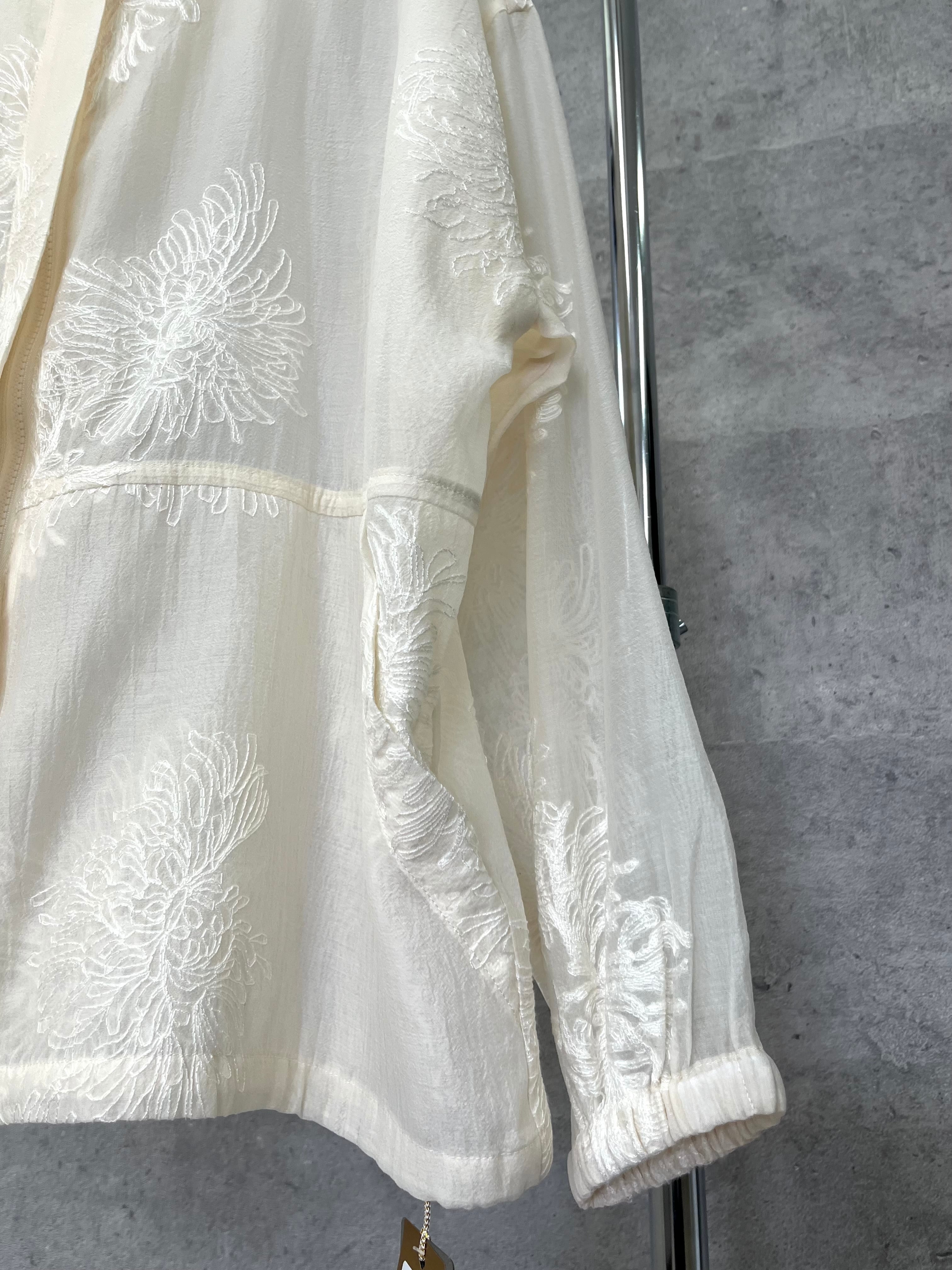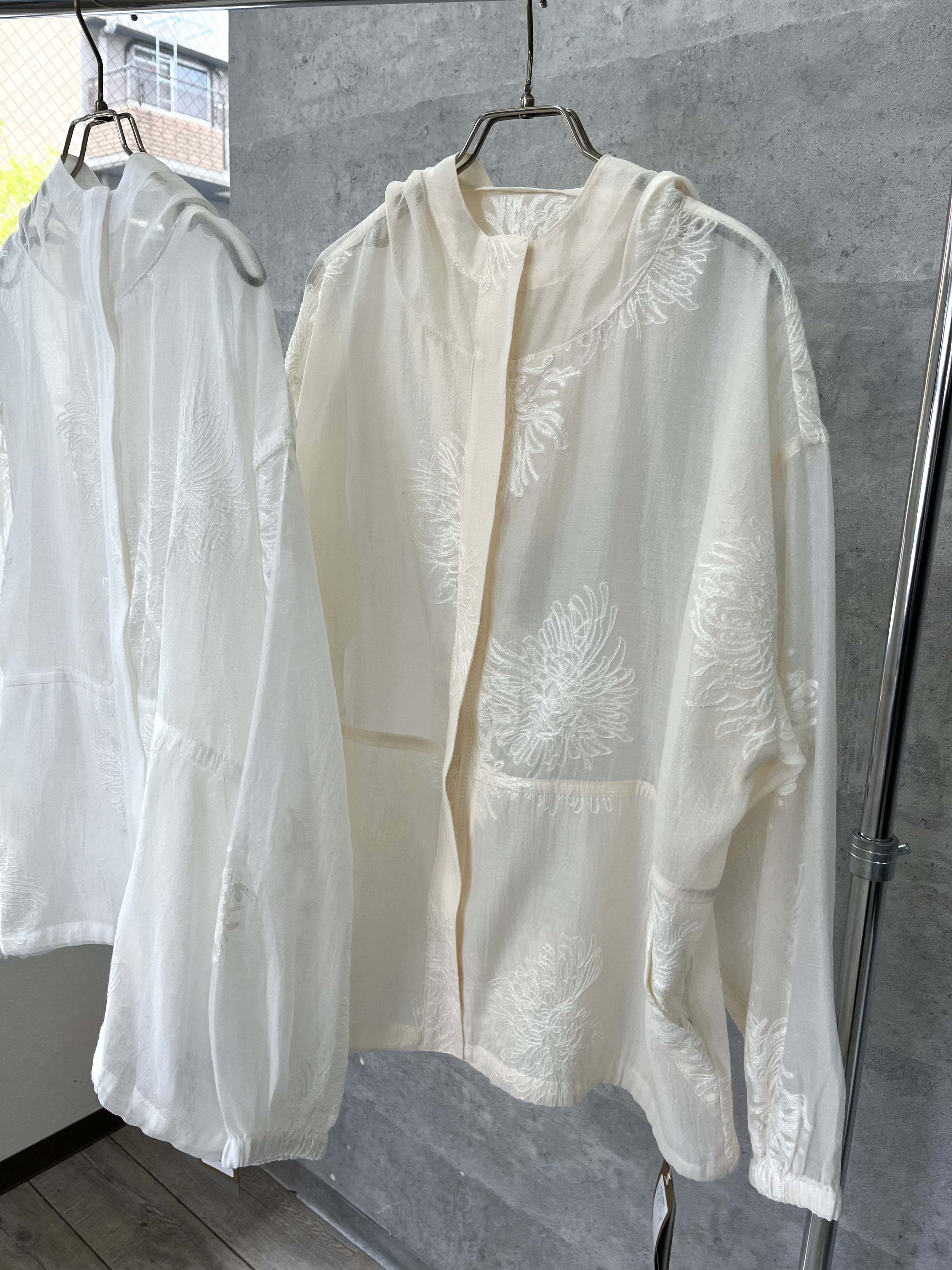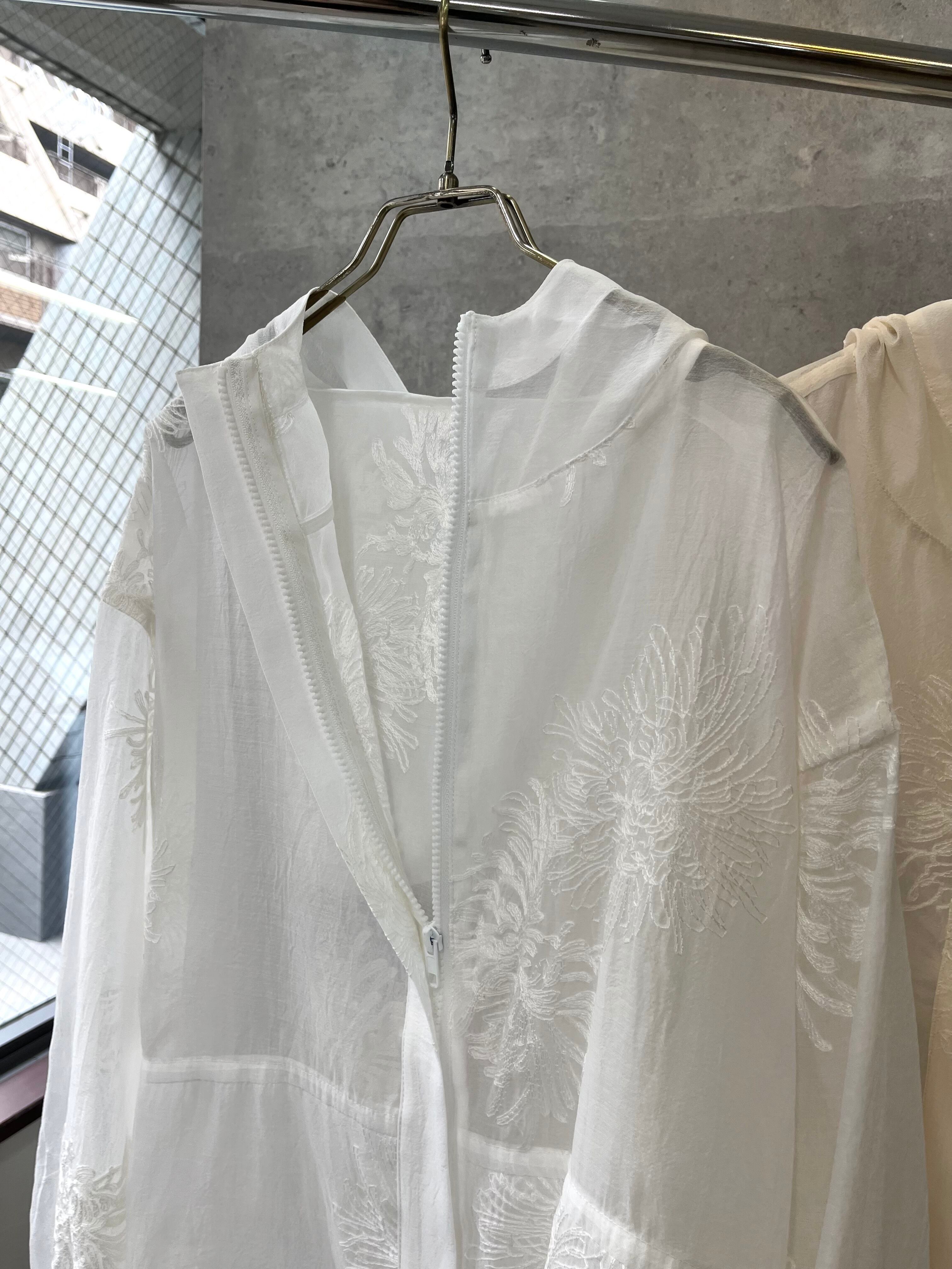 ≫≫ 涼しげなシアーに大きなフラワーモチーフが刺繍されたテキスタイルが特徴のジップフーディー。