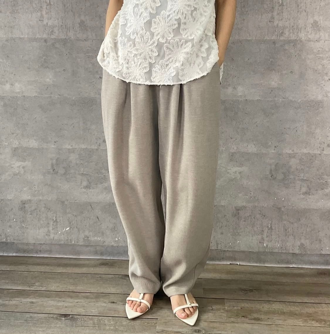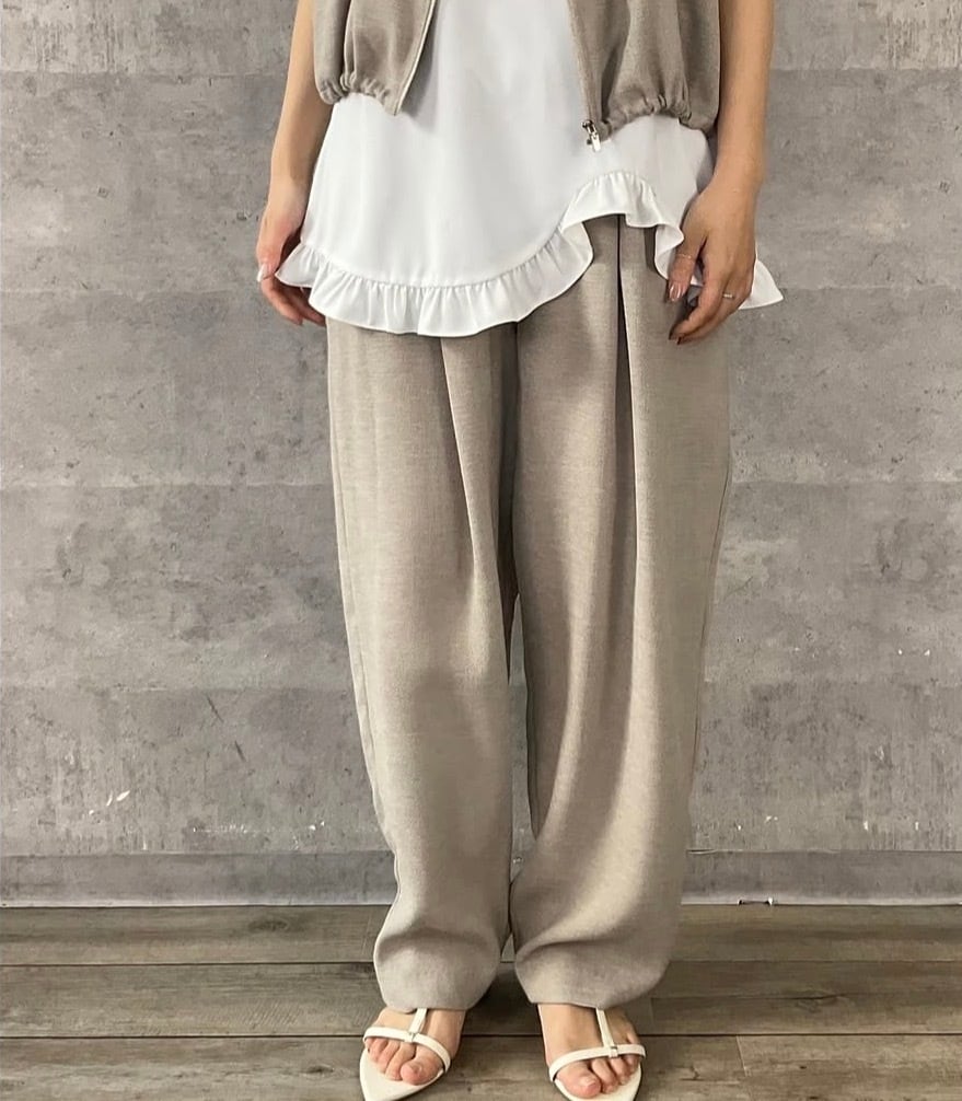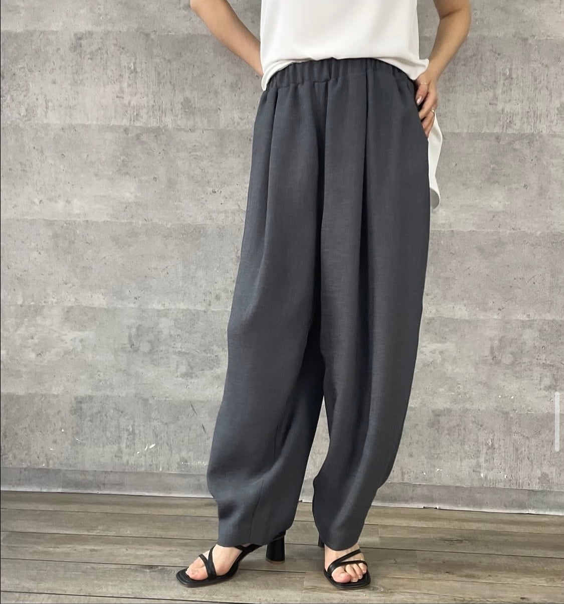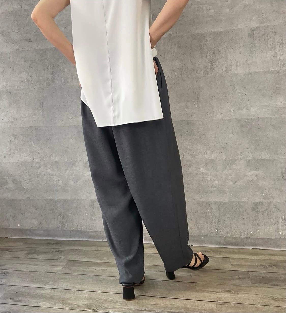 タックが生む柔らかなボリュームのウエストラインと裾の細さのコントラストがスタイル良く見せてくれます。