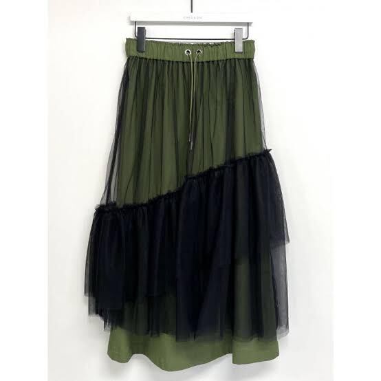 ≫≫シアーな素材と程良いボリューム感あるチュールとナイロン地の異素材がMIXされたスカートです。ミリタリーな雰囲気の中にアシンメトリーにデザインされたチュール部分が女性らしくカジュアルな印象に☺︎