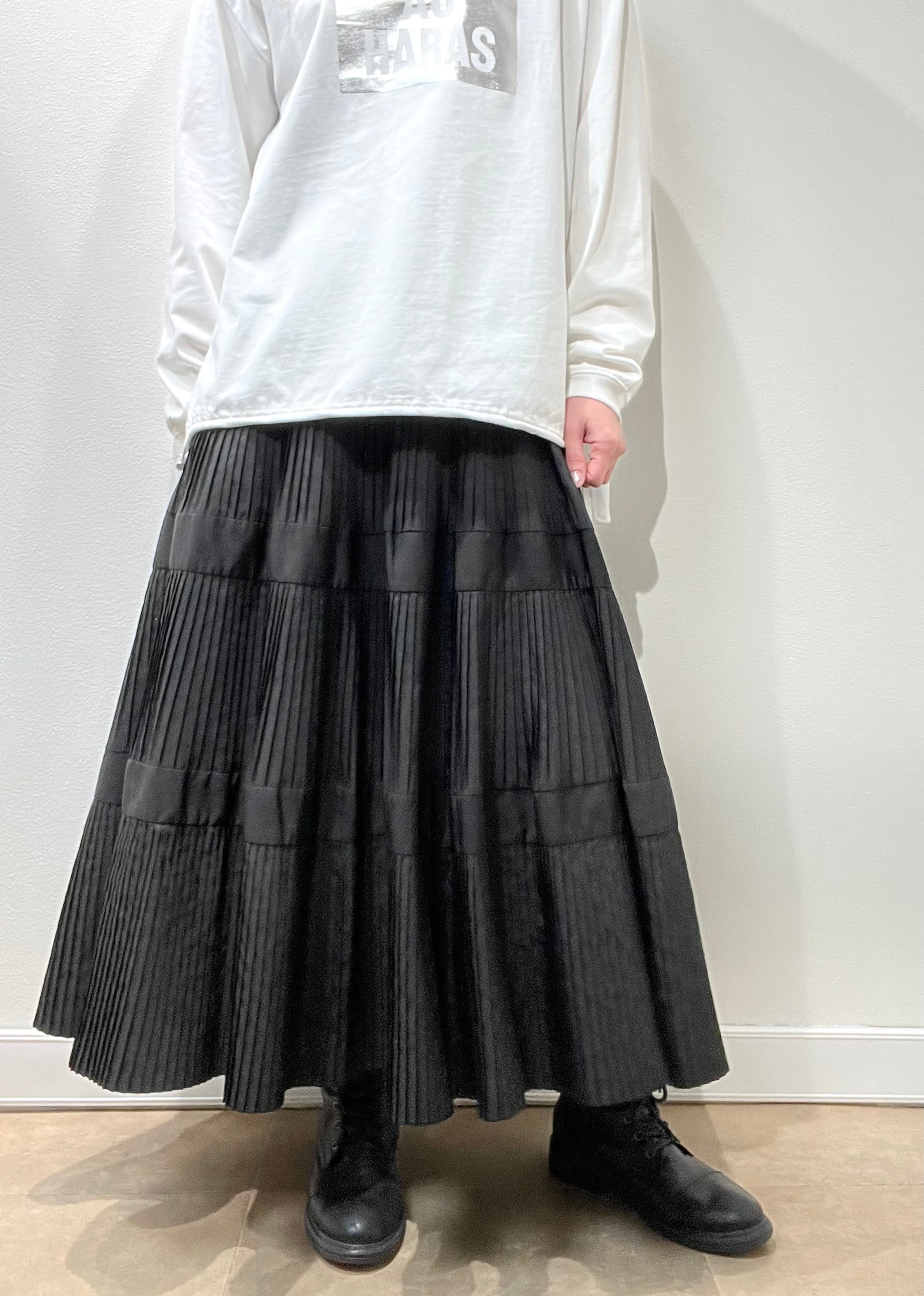 ≫≫ランダムなプリーツデザインのフレアスカート。広がり過ぎず、柔らかく揺れ合わせやすいスカートです。