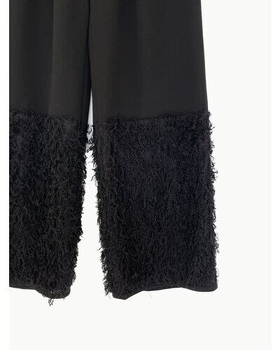 身頃部分は膨らみのあるジョーゼット素材を使用し、裾部分にはリリヤーンにモケモケが絡んだ様なフリンジ素材で切替ています。カジュアル過ぎない上品に仕上げています。