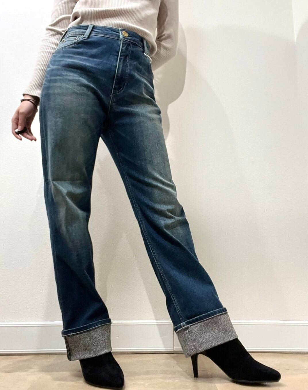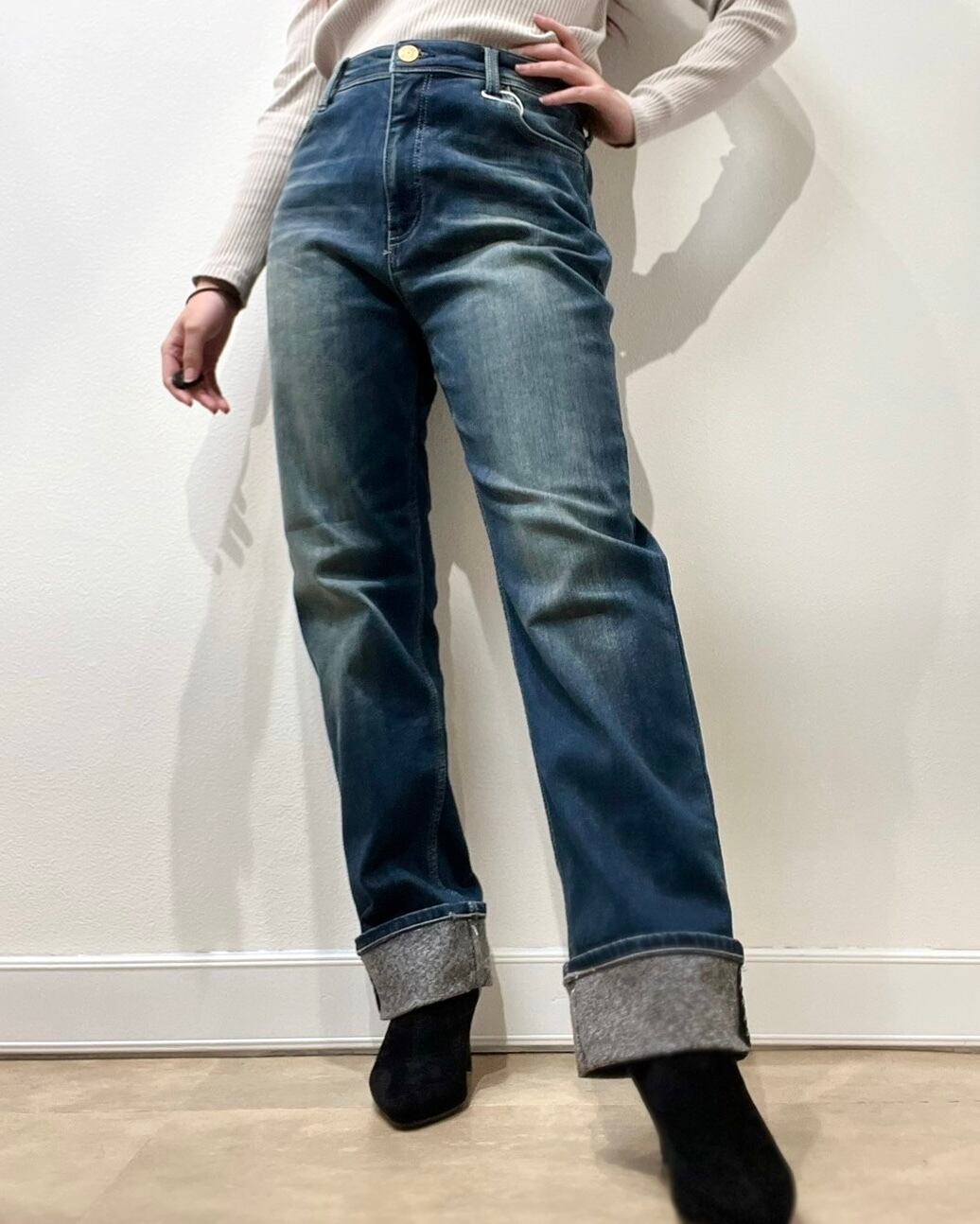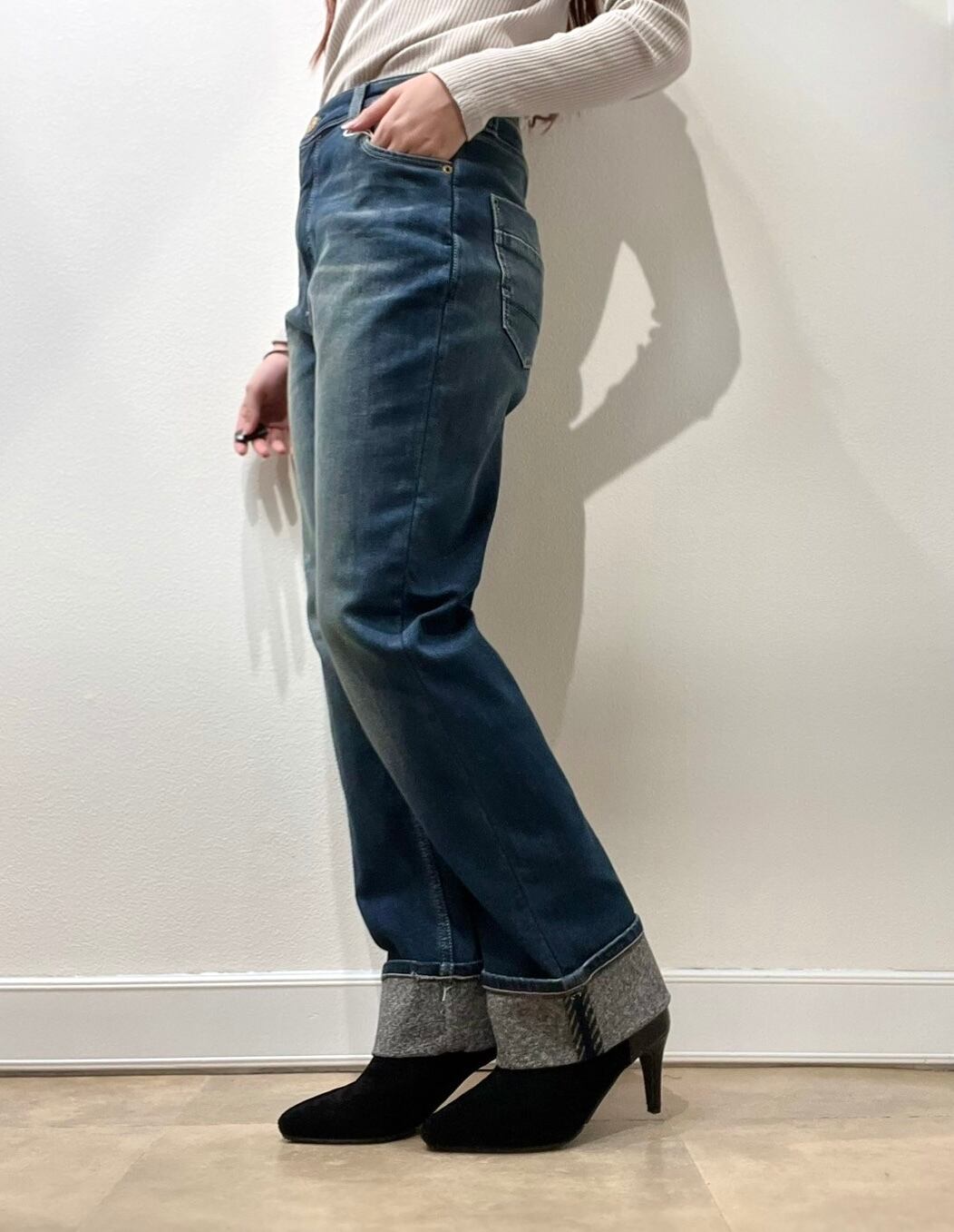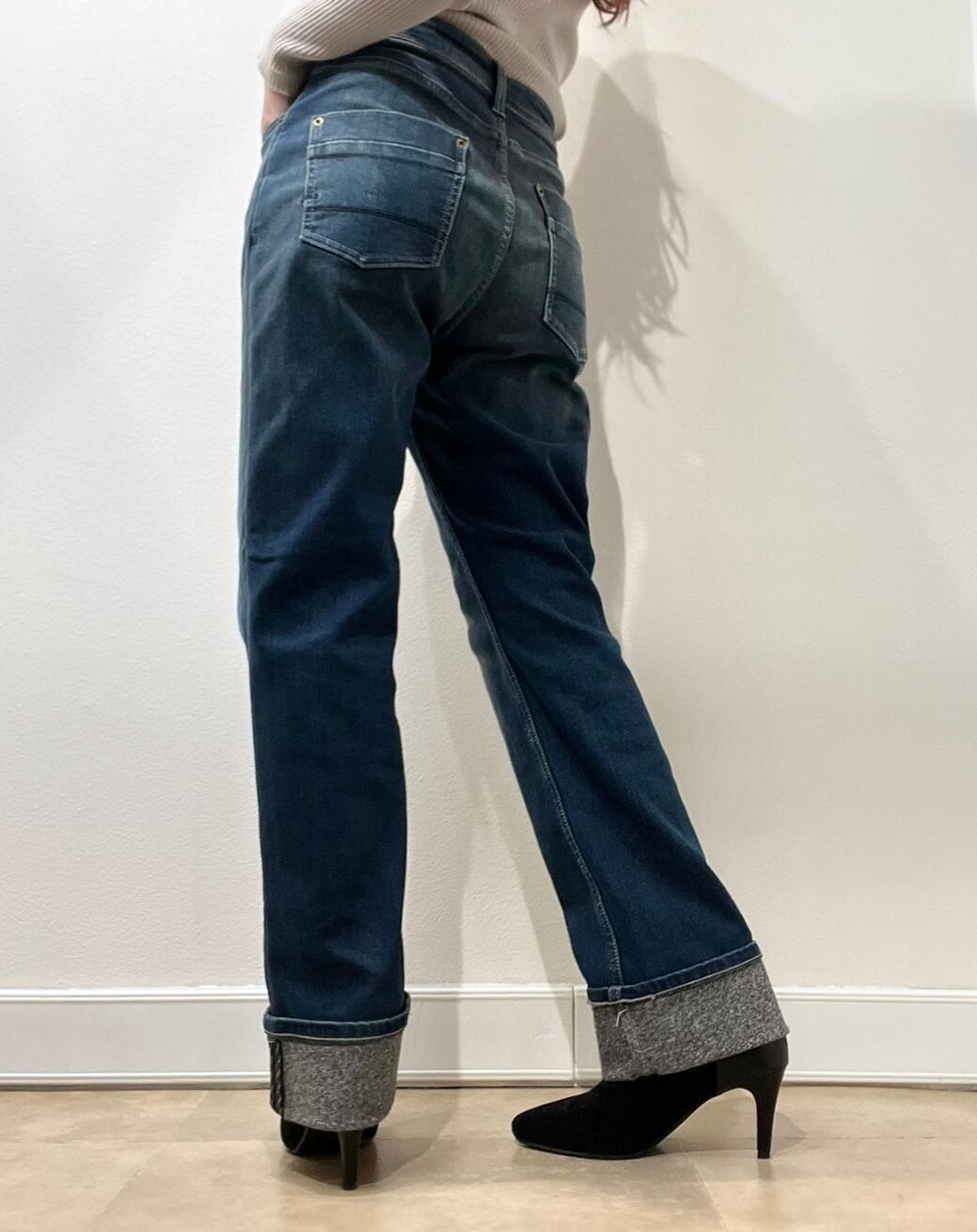 ≫≫ 特殊な二重織りで裏面に保温性を持たせた肌寒いシーズン対応のデニムシリーズ。今回はストレートロールアップデザインです。裏は裾上げしてもクオリティ変わらずパイピングが見える仕様となっております。1枚生地で暖かくありつつも。見た目は着膨れ感がなく、縦ラインを強調した脚長効果抜群のシャープなシルエットです。
